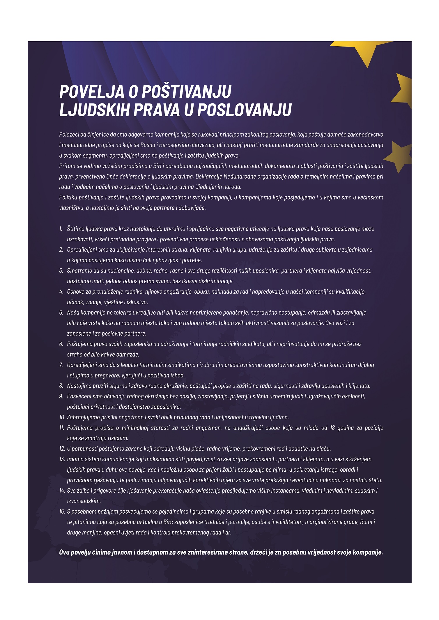 Poveljom o poštivanju ljudskih prava u poslovanju, kompanije u BiH javno iskazuju svoju opredijeljenost za poštivanje i zaštitu ljudskih prava. U Povelji je istaknuto da se kompanije vode važećim propisima u BiH i odredbama najznačajnijih međunarodnih dokumenata u oblasti poštivanja i zaštite ljudskih prava, prvenstveno Vodećih načela o poslovanju i ljudskim pravima Ujedinjenih naroda.
